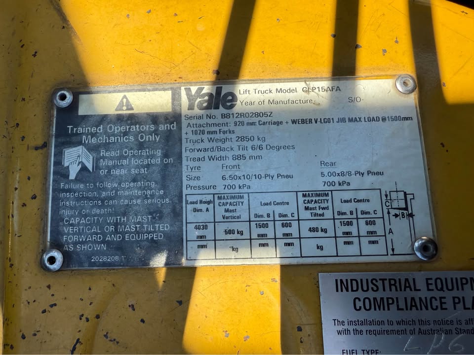 1.5T forklift. Low hours 2600 Excellent condition. 4050mm lift height. 1070mm forks. LPG. Solid tyres. Fully serviced. Plus GST with tax invoice. 1mth warranty